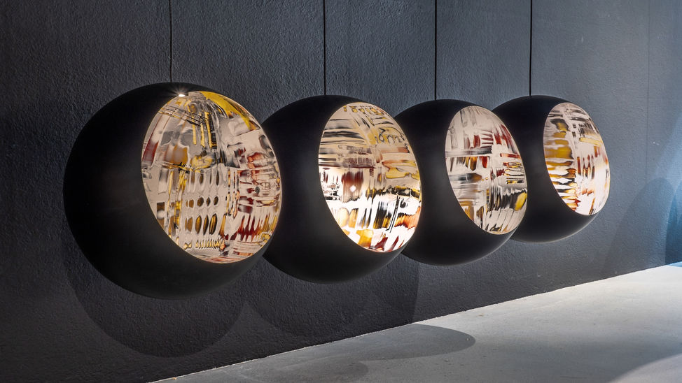 Inside each sphere lies a handcrafted artwork, created using my signature lacquer and scratch technique. Integrated LED spotlights illuminate the interior, highlighting the intricate designs. Each sphere also features an almost invisible platform, allowing sculptures or objects to be displayed without obscuring the background art.