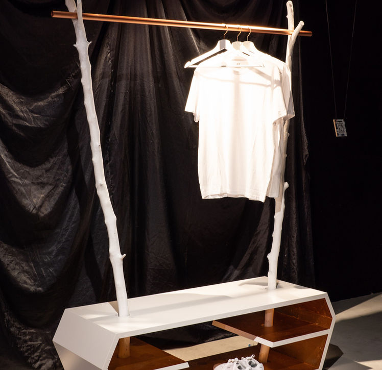 The wardrobe is coated on the inside with copper leaf and spraypainted supermatt white on the outside. An additional layer of lacquer on the inside provides protection. The two holders of the clothes rail are branches from the Swiss (Baden) deciduous forest. The clothes rail itself is a copper pipe, which is also lacquered.
