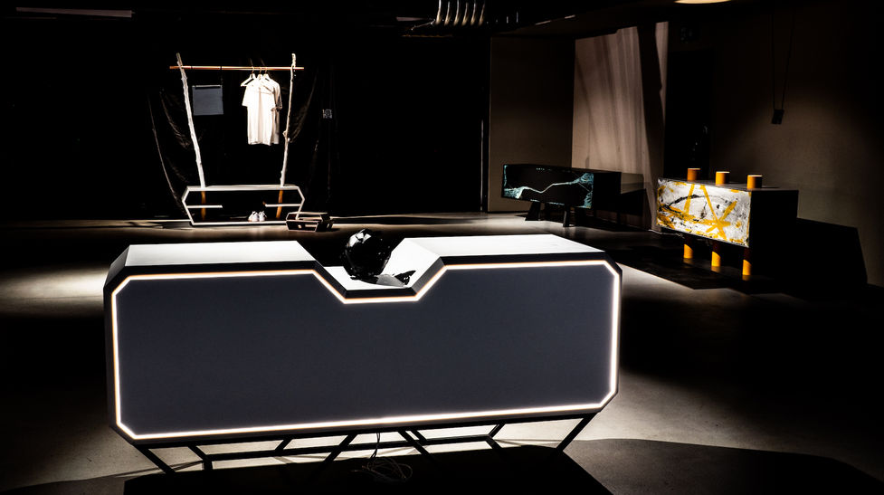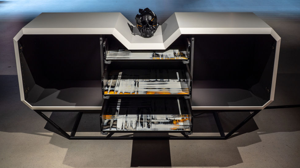 It is made of acid-resistant and durable Hi-Macs (Corian) as the outer shell. The interior is made of robust Supermatt anti-fingerprint coated chipboard. The feet are custom made by the steel artist Angelo Rizutto. Inside are two built-in paintings which are backlit, so you can find everything you want. To highlight the furniture I have installed a back panel with continuous LED lighting, which provides a nice discreet backlighting of the furniture on the wall or a striking light edge when used in an open space.